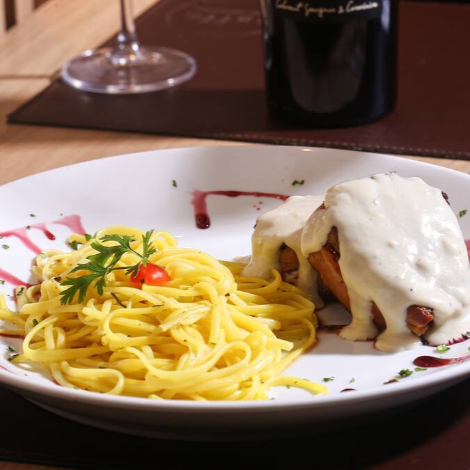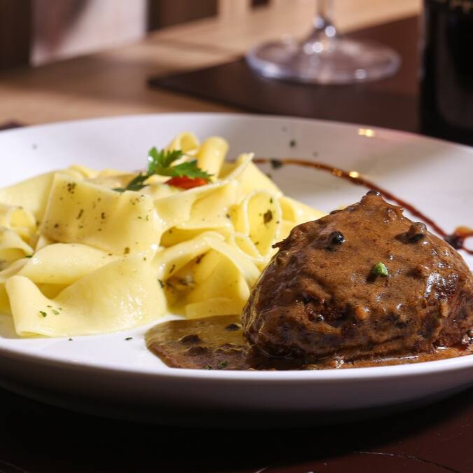Medalhão de filé mignon ao molho de gorgonzola. Acompanha massa na manteiga
