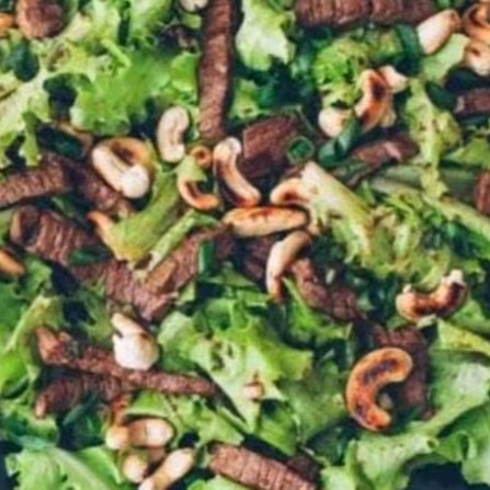 Mix de folhas verdes temperadas, 150g de filé mignon e castanhas.