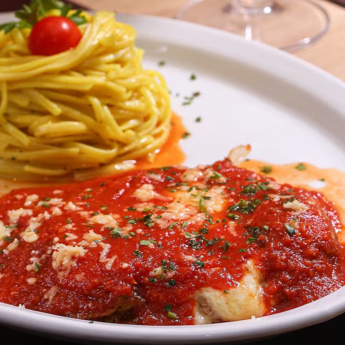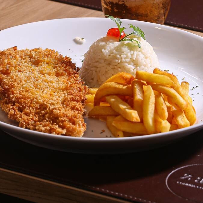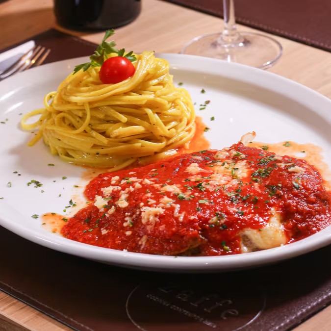 Filé mignon empanado com parmesão e ovos, muçarela, molho de tomate artesanal. Acompanha massa na manteiga