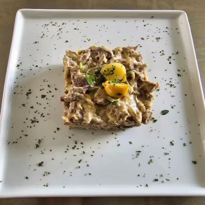 Massa fina e crocante com o recheio inspirado em um dos pratos mais pedidos da casa: filé mignon ao molho de vinho.