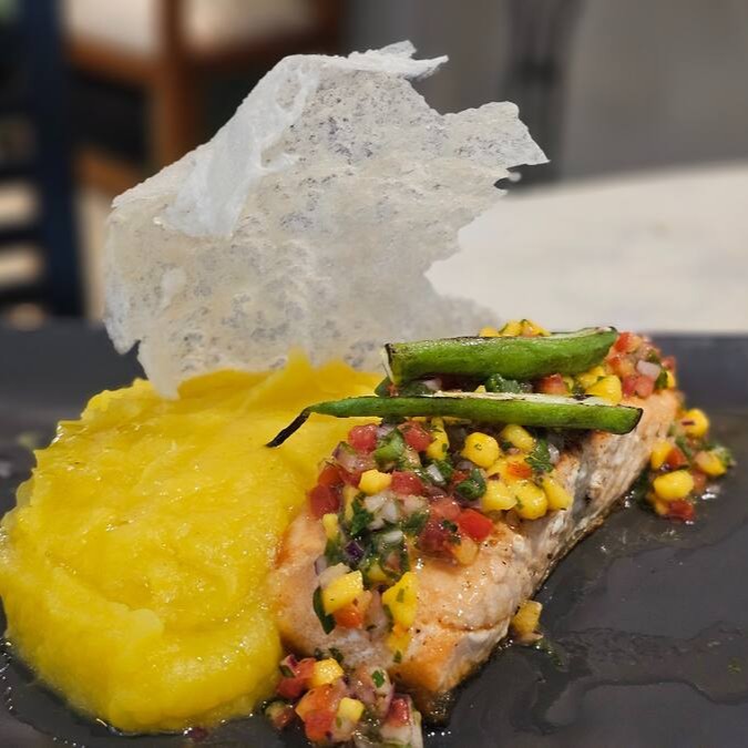 150g de salmão cuidadosamente grelhado, acompanha purê de mandioquinha e micro vinagrete de manga e molho oriental