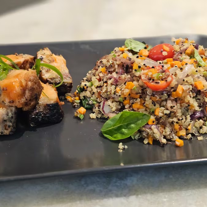 Mix de quinoa com legumes, acompanhada de cubos de salmão grelhados com aroma oriental.