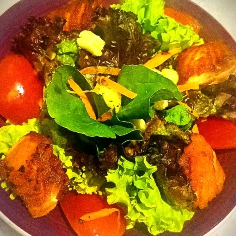 Salmão grelhado na chapa, mix de alfaces, rúcula e cenoura, levemente temperadas com azeite e vinagre.