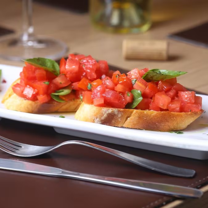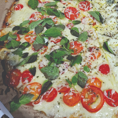 Massa fina e crocante coberta com mussarela, tomate fresco e folhas de manjericão