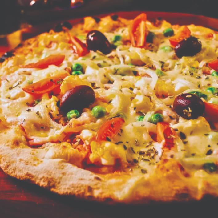 Massa fina e crocante, coberta com a combinação clássica com presunto, ovos cozidos, cebola, pimentão, azeitonas e mussarela.