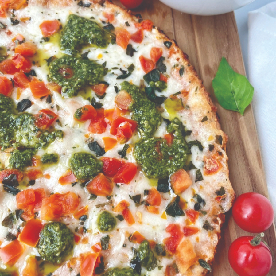Massa fina e crocante coberta com mussarela, tomate cereja, folhas de manjericão e pesto.