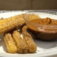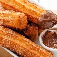 6 unidades de Churros Espanhóis, coberto no açúcar e canela com brigadeiro no copo.