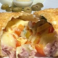 Benevolente pastel de portuguesa com queijo, presunto, ovo, tomate, azeitona e manjericão.