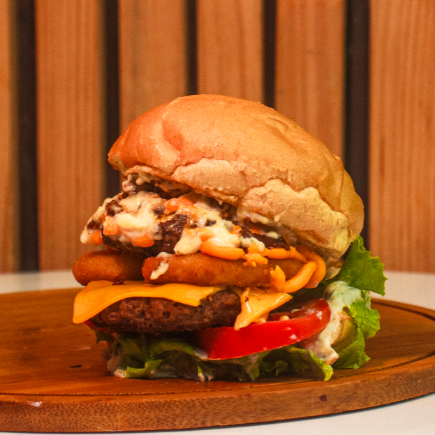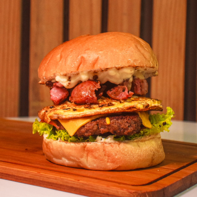 Pão, Carne, Salada, Cebola Caramelizada, Maionese Especial, Queijo Prato, Bacon, Batata Palha