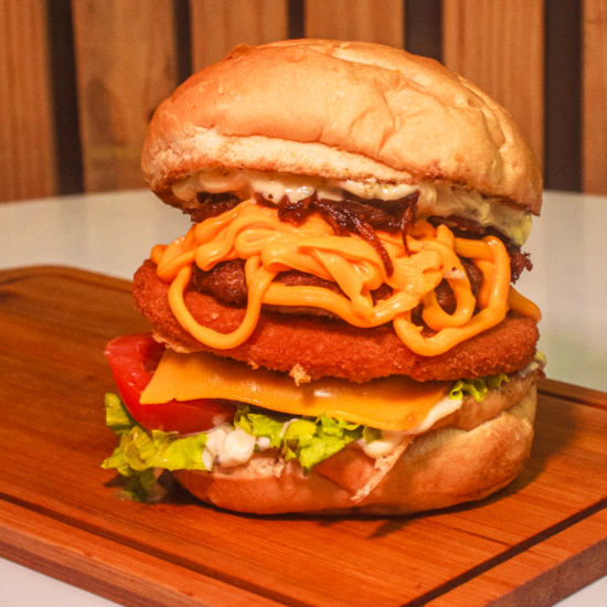 Pão, 2 Carne, 1 Frango Empanado, Salada, Bacon, Cebola Caramelizada, Queijo Cheddar