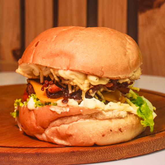 Pão, Carne, Bacon, Cebola Caramelizada, Maionese Especial, Queijo Prato, Batata Palha, Salada, Batata Frita, Refrigerante ou Suco da Fruta