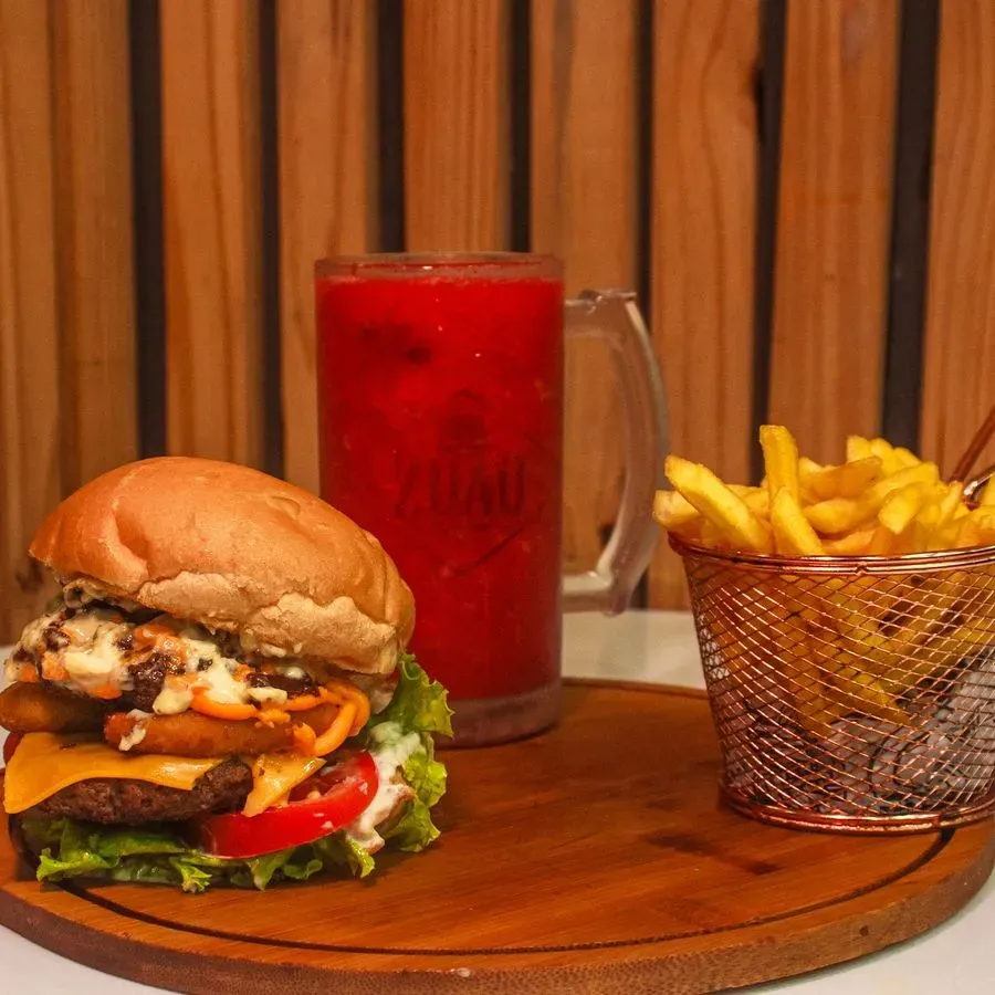 Pão, Carne, Queijo Cheddar, Cebola Caramelizada, Molho Especial, Batata Frita, Refrigerante ou Suco da Fruta