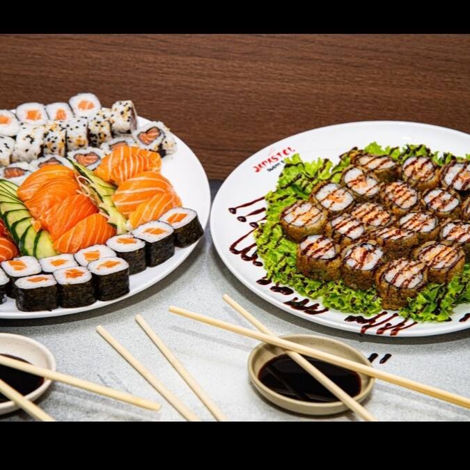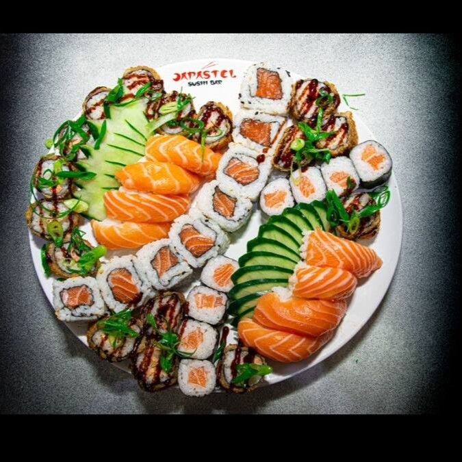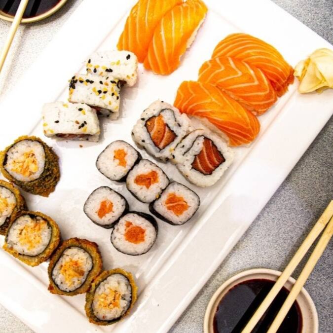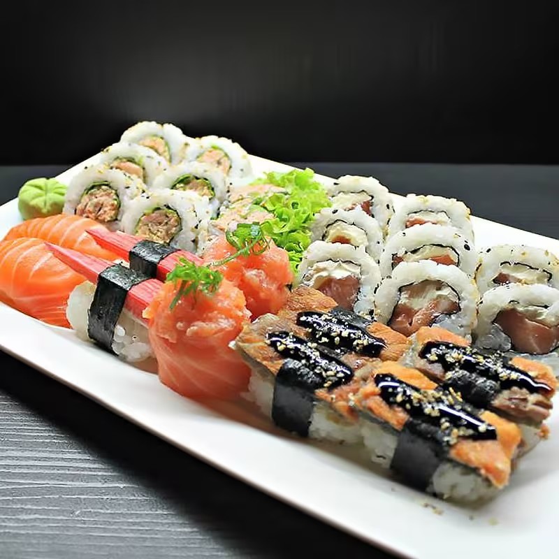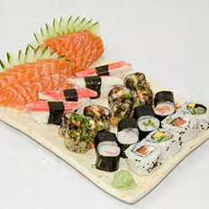 20 sashimi salmão, 12 hot roll, 12 hossomaki, 12 uramaki, 8 niguiri misto e 6 joy salmão