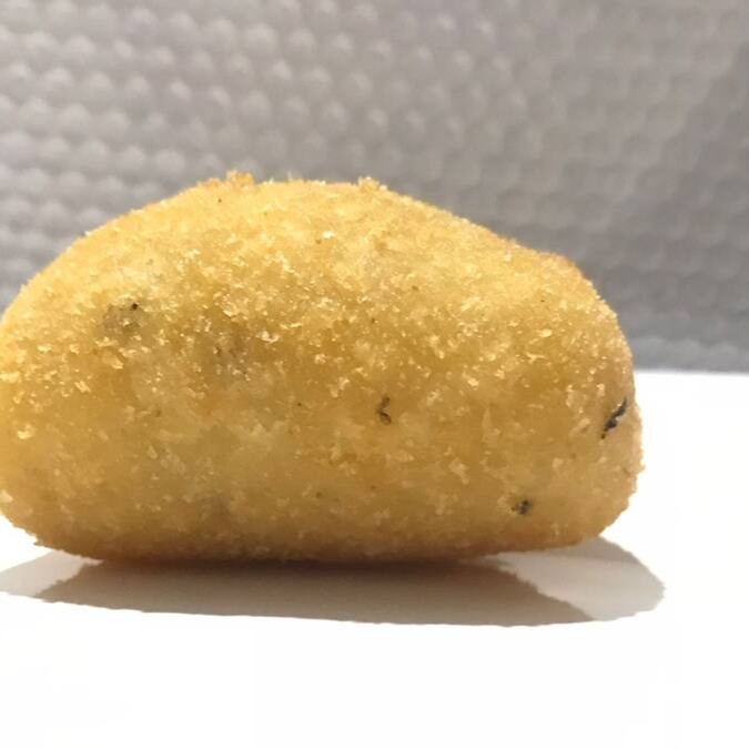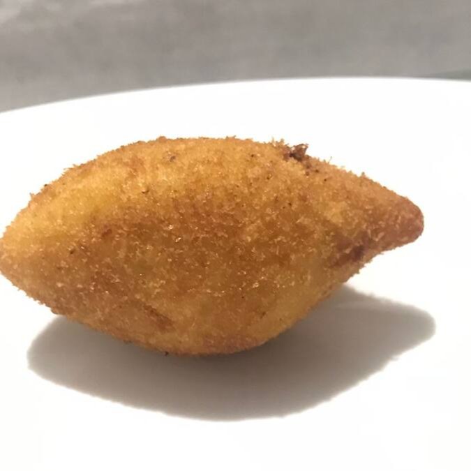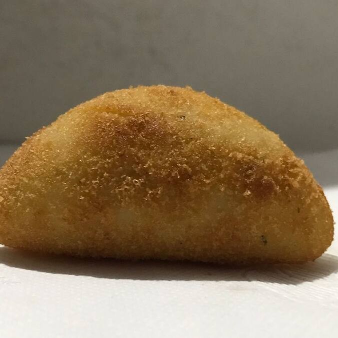 Risoles feito com massa de batata e leite, recheado com mussarela e presunto.