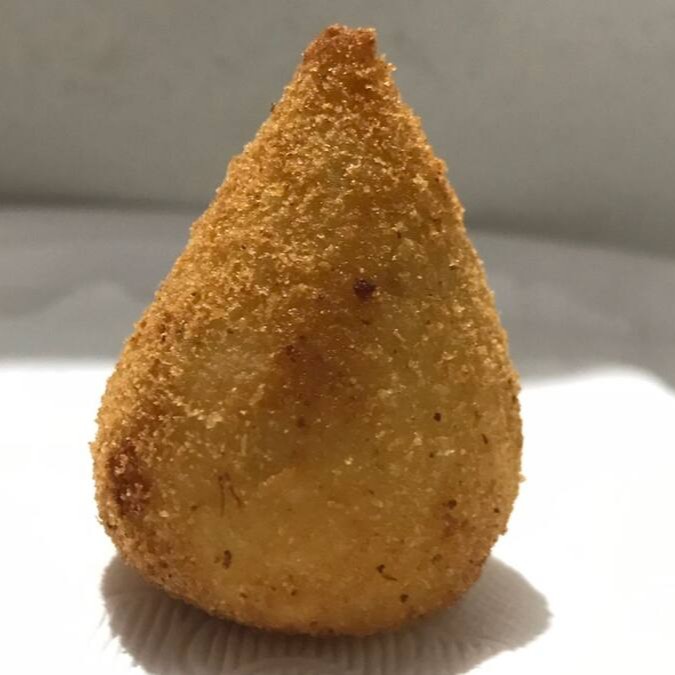 Coxinha feita com massa de batata e leite, recheada com frango desfiado.