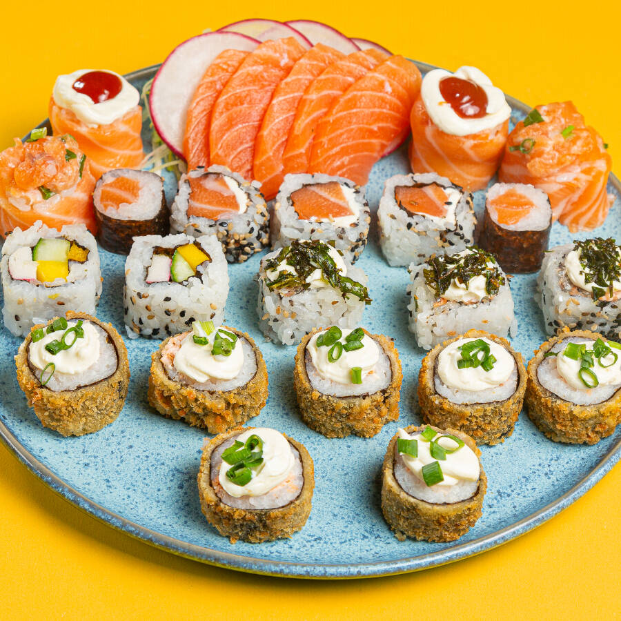 4 sashimis de salmão, 2 niguiris de salmão, 2 uramakis de salmão, 2 hossomakis de salmão, 6 hot rolls, 2 uramakis skin e 2 uramakis california. *este item é padrão e não pode ser alterado*