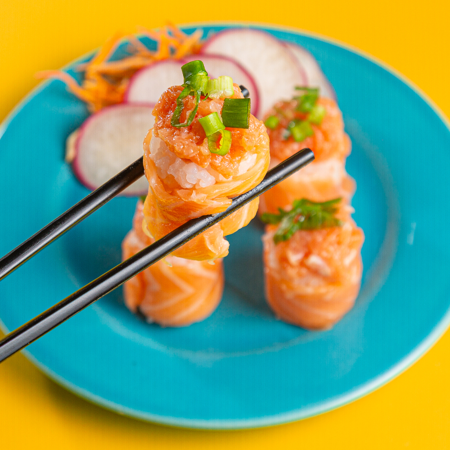 Cubos de salmão marinado, cebola roxa, pimenta dedo de moça e molho especial 99 sushi.