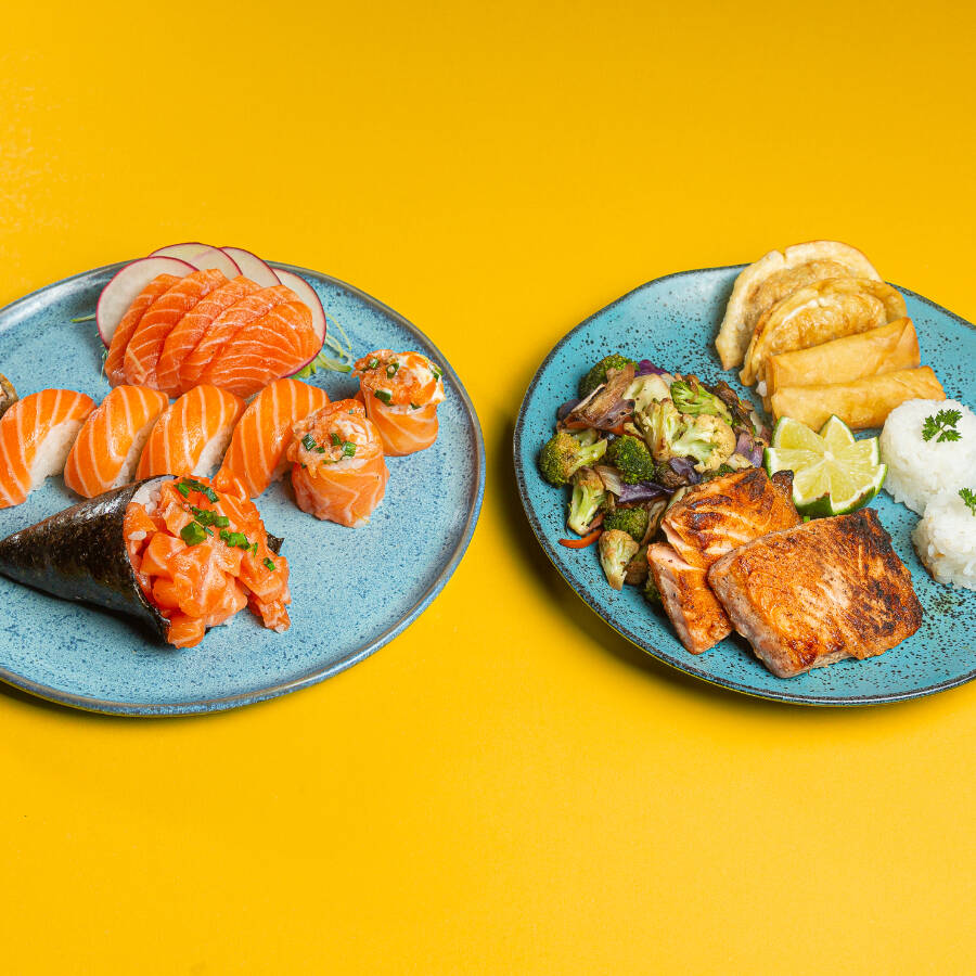 100g salmão grelhado (acompanha gohan e legumes), 2 guiozas bovinas, 2 harumakis de queijo, 1 temaki salmão, 4 sashimis salmão, 4 niguiris salmão, 2 hot rolls, 2 jhows salmão e 1 Coca-Cola gelada (lata 220ml)