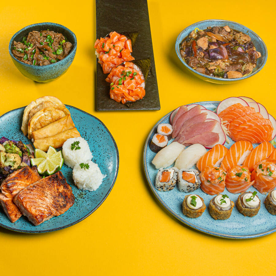 100g salmão grelhado (acompanha gohan e legumes), 100g yakisoba misto, 100g shimeji, 2 guiozas bovinas, 2 harumakis queijo, 2 temakis salmão, 4 sashimis salmão, 4 sashimis atum, 4 jhows salmão, 4 hot rolls, 2 hossomakis salmão, 2 uramakis salmao, 4 niguiris salmao, 2 niguiris peixe branco