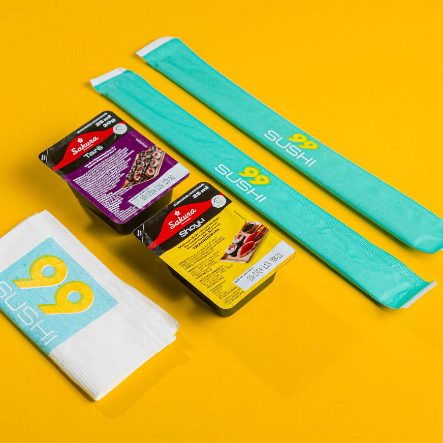 Super kit molhos 0,99 sushi: 2 sachês de shoyu Sakura (8ml), 1 potinho tarê sakura (18ml), 2 hashis e um guardanapo