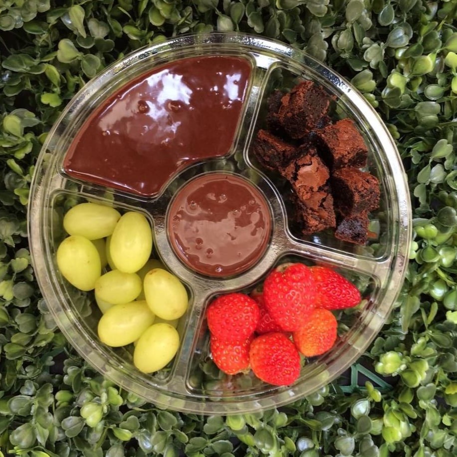 Delicioso fondue de chocolate e Nutella ! Você não pode deixar de provar essa delicia! São100g.de ganashe de chocolate ao leite, 40g de ganashe de Nutella, brownie , morangos e uvas. Serve 2 pessoas.