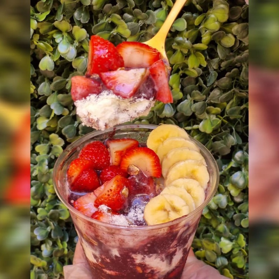 Copo do delicioso Açaí do Trevo da Ancheita para refrescar nos dias quentes. Aqui você escolhe as frutas e os complementos.