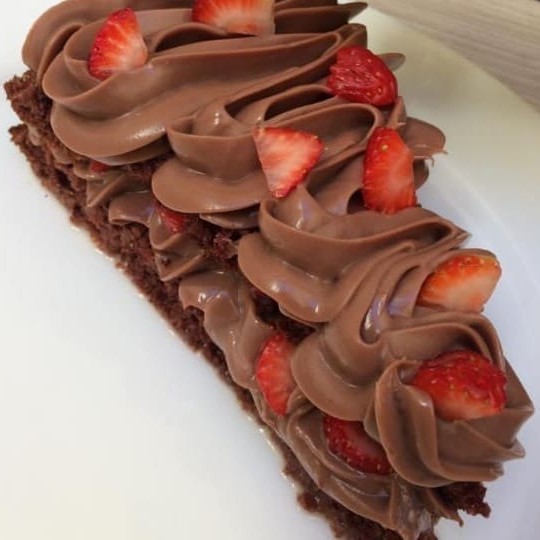 Uma fatia molhadinha de bolo de chocolate 50% com uma generosa camada de um delicioso creme belga de chocolate, com morangos fresquinhos. De cobertura vai mais uma camada de creme de chocolate.