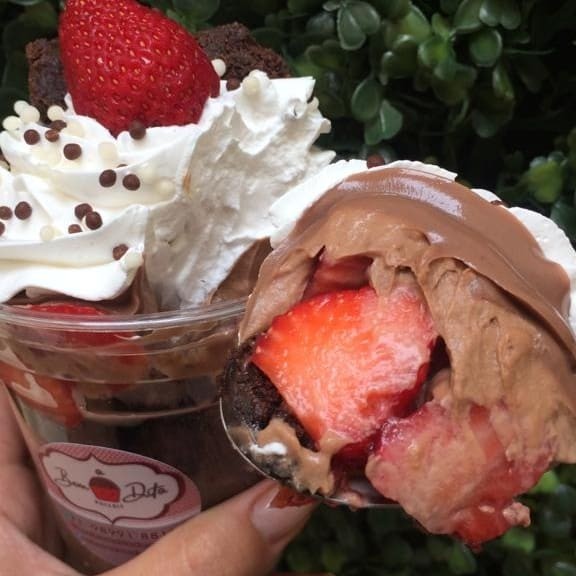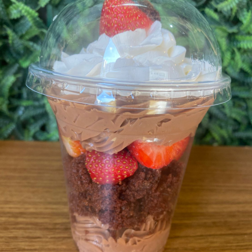 Copo de 380 ml. Mousse de chocolate e creme belga de brigadeiro mega cremoso, intercalado com quadradinhos de brownie e morangos super fresco cortados na hora. Na cobertura, nosso delicioso e levíssimo chantilly.