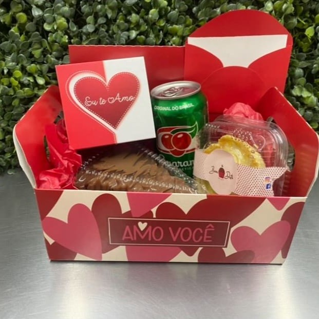 Presentinho para mimar a pessoa que você amaaa ️ 1 Cartão Especial 1 saco poli liso 45x 60 1cesta personalizada 1 laço 1 Caixinha personalizada Eu te amo 1 Fatia leite Ninho com morango 1 Empada de Frango ou carne 1 Coca ou Guaraná Por favor informe nas observações o nome da pessoa a receber e o recadinho que deseja :)