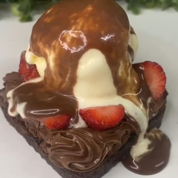 Nosso delicioso Brownie chocolatudo coberto com Nutella Pura e Original e uma bola de 50gr de sorvete de creme Nestlé (enviado em um copinho de isoporpara você finalizar). Na foto do produto tem o adicional de morangos frescos e ganashe de Nutella que você pode pedir como adicional