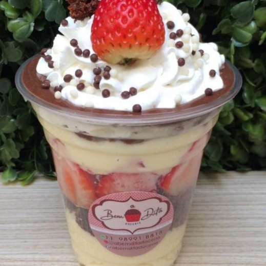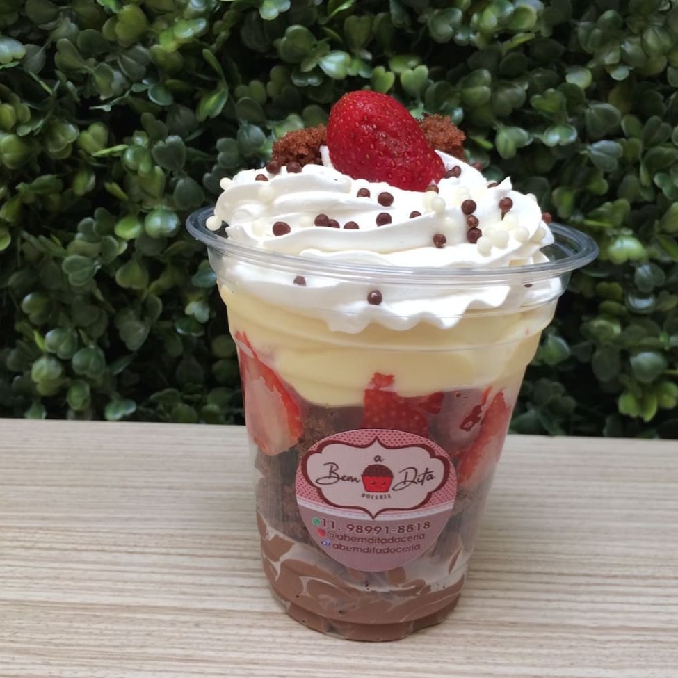 Copo de 380ml O nosso creme belga brigadeiro mega cremoso, quadradinhos de bolo de chocolate , morangos fresquinhos cortados na hora, coberto por um levíssimo chantilly. Cada colherada é um Hummmmmm prove e nos cont depois
