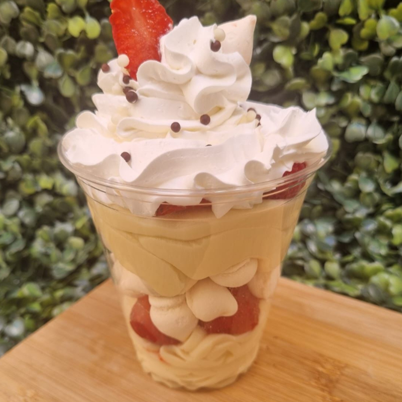 Copo de 380 ml. Junção do nosso creme belga trufado Laka e do nosso creme belga de Leite Ninho Original intecalado com suspiros e morangos frescos picadinhos. Para ficar perfeito, não poderia faltar nosso levíssimo chantilly.