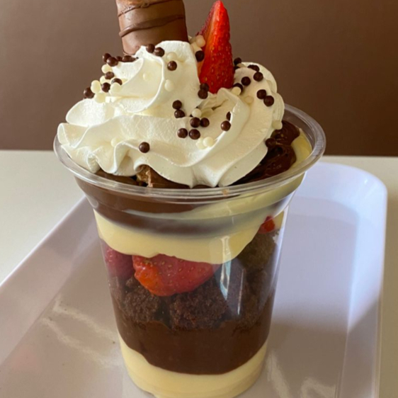 Copo de 380 ml. Com um delicioso creme belga de Coco, quadradinhos de bolo de chocolate (opção de troca por brownie com acrescimo de R$3,00) , morangos fresquinhos picados, creme de chocolate, finalizado com um levísimo chantily.