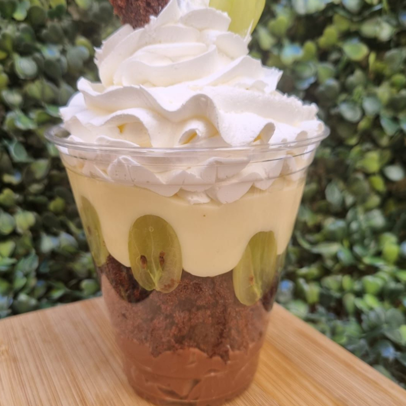 Copo de 380ml. Uma deliciosa camada de creme belga Ninho, quadradinhos de bolo (opção de upgrade para brownie por +R$3,00) uvas fresquinhas, com maisssss creme belga Ninho Original. Por cima, um chantilly bem lisinho e leve