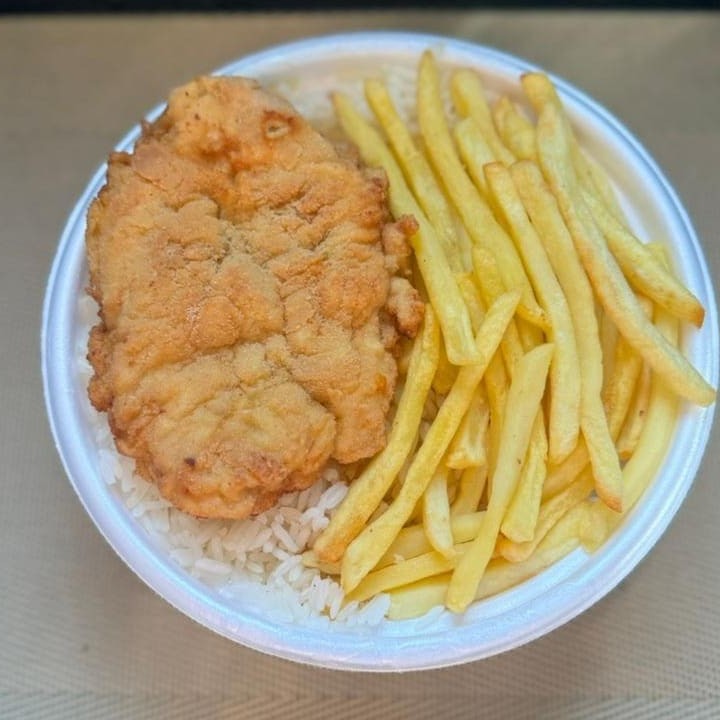 Marmita com delicioso filé de frango empanado na massa crocante acompanhado de arroz branco, feijão e batatas fritas. Marmita indicada para 01 pessoa.