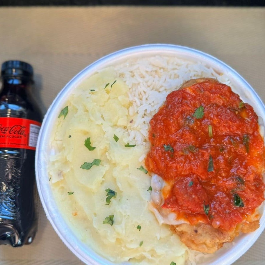 Marmita com delicioso filé de frango parmegiana (empanado na massa crocante coberto com molho de tomates e queijo) acompanhado de arroz branco e purê de batatas inglesas. Acompanha refrigerante pet Coca Cola Zero sem açúcar bem gelado. Marmita indicada para 01 pessoa.