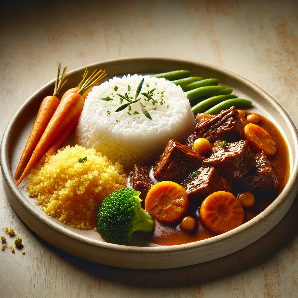 Picadinho de carne macio, preparado com cenoura e vargem salteadas, servido com arroz branco soltinho, feijão caseiro bem temperado e uma farofinha crocante. Uma refeição completa, saborosa e com gostinho de comida caseira!