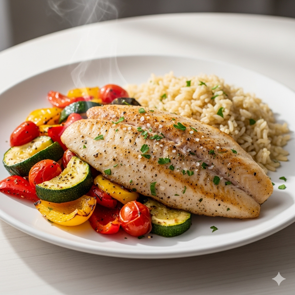 Uma refeição completa e balanceada que une sabor e saúde. Nosso suculento filé de tilápia é grelhado no ponto e servido com arroz integral soltinho e um delicioso mix de legumes defumados e temperados. Uma escolha perfeita para quem não abre mão do sabor.