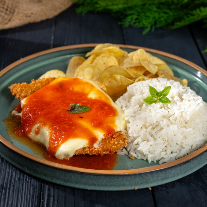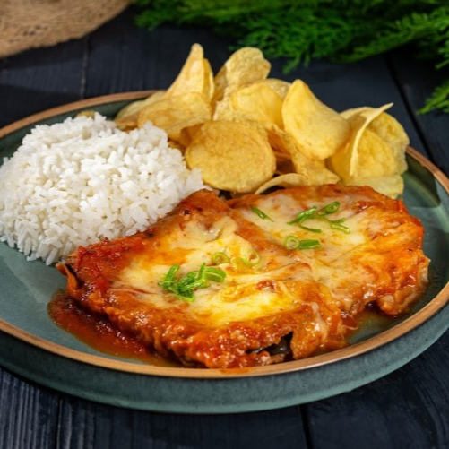 Carne empanado, acompanhado de arroz e batata chips, coberto com molho de tomate caseiro e muuuuito queijo!