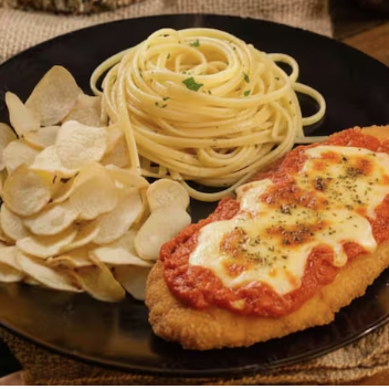 Filet de frango empanado e servido com molho de tomate caseiro e coberto com muuuuito queijo! Acompanha arroz e batata chips.
