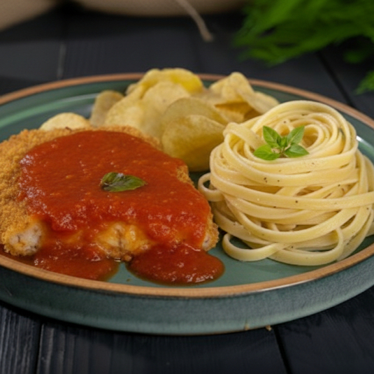 Prepare-se para uma explosão de sabores com nosso exclusivo Filé de Saint Peter à Parmegiana! O peixe, cuidadosamente empanado e frito até a crocância perfeita, é coberto por um molho de tomate artesanal e uma generosa camada de queijo mussarela gratinado. Para acompanhar, um delicioso talharim fresquinho e batatas chips sequinhas e crocantes. Uma experiência gastronômica completa e memorável!