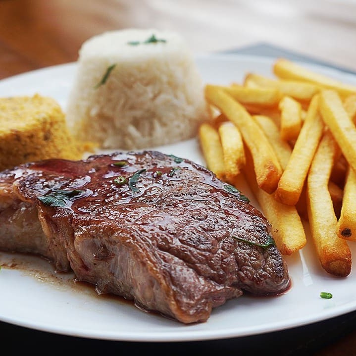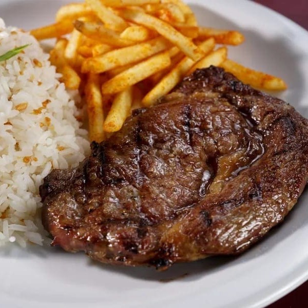 Desfrute de um suculento Bife Ancho, magistralmente preparado para revelar todo o seu sabor robusto. Acompanhado por uma generosa porção de 250g de arroz, perfeitamente cozido e delicadamente temperado. Adicione um toque pessoal escolhendo 150g do acompanhamento de sua preferência. Para aprimorar ainda mais esta experiência gastronômica, o prato é servido com um vinagrete vibrante e um irresistíve