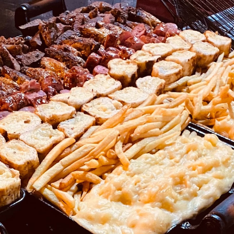 O 'Chapão' é um deleite gastronômico robusto e cheio de sabor, ideal para servir de 4 a 5 pessoas. Esta maravilha culinária abriga 400 gramas de suculenta picanha, valorizadas pela adição de dois espetos de linguiça defumada e dois espetos de tulipa suave e macia. O prato ganha um toque especial com a inclusão de dois pães de alho, assados até atingir a perfeição. Para enriquecer ainda mais a expe