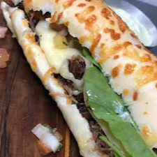 Pão com parmesão 20 cm cupim desfiado queijo vinagrete maionese da casa e rúcula