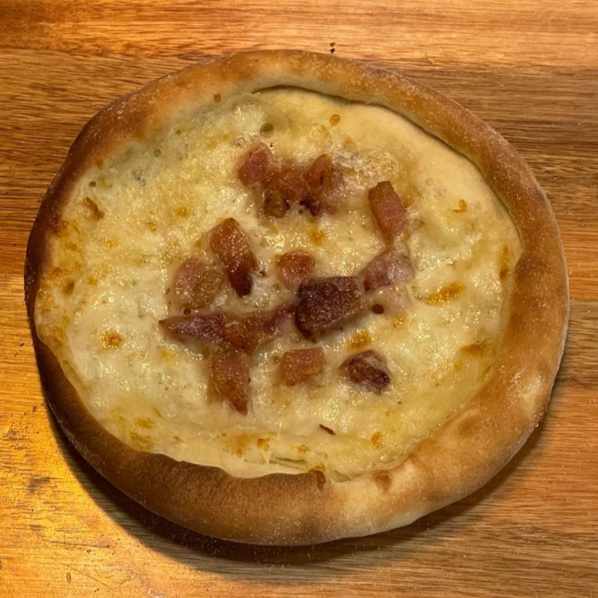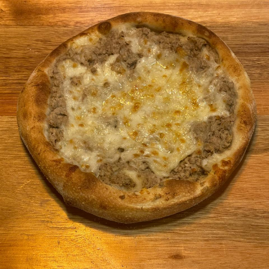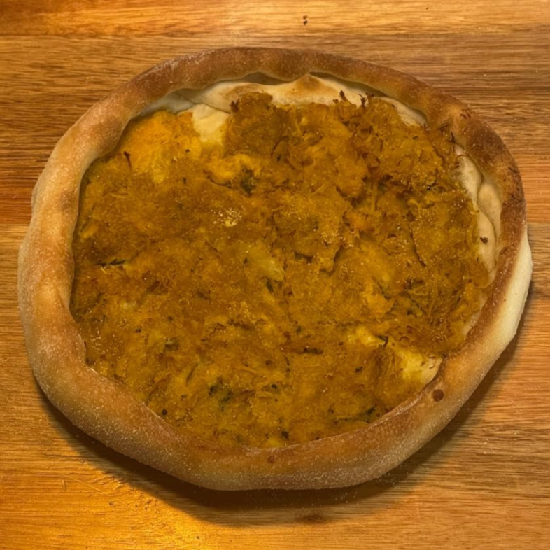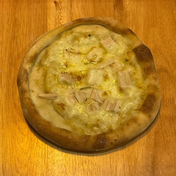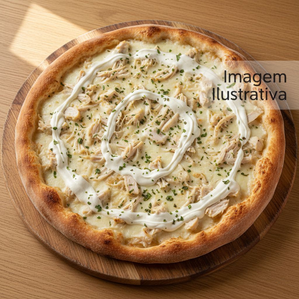 Saborosa pizza com frango desfiado e catupiry, finalizada com orégano.