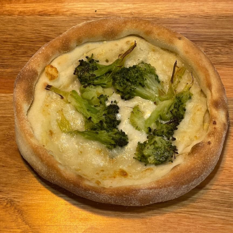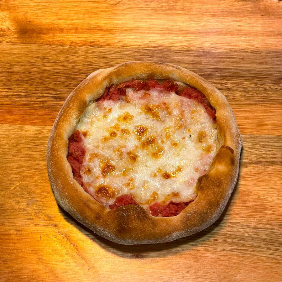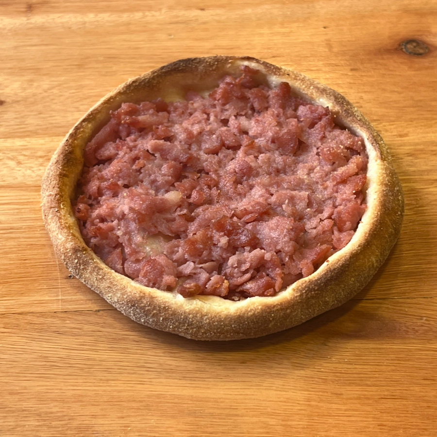 Pizza clássica com molho de tomate, presunto, ervilha, cebola, azeitonas, ovos e queijo mussarela.
