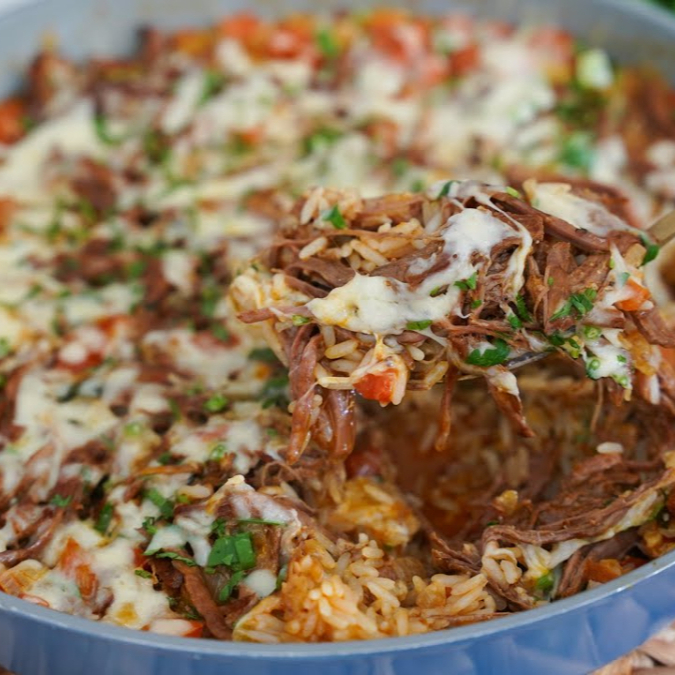 Arroz com fraldinha, pimentão, cebola, salsinha e mussarela.
