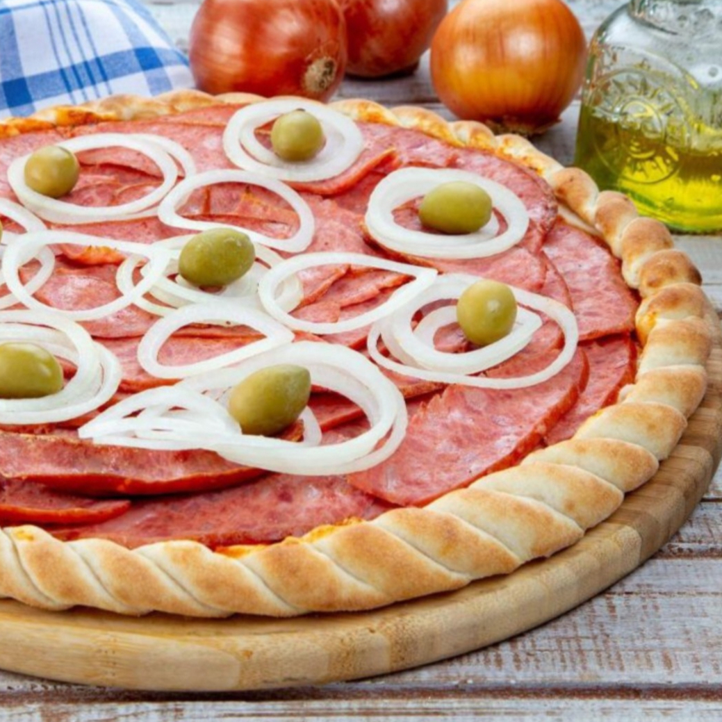 Pizza tradicional calabresa com cebola. Pizza promocional 8 fatias