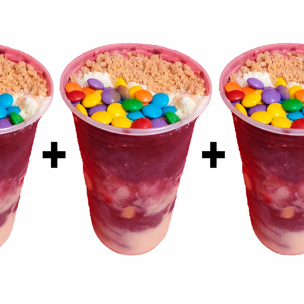 Um combo pra familia! São 03 Copos de Açaí de 200 ml com leite condensado + leite em pó + confete + paçoca.