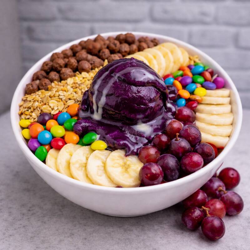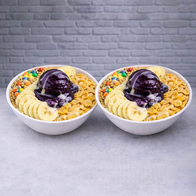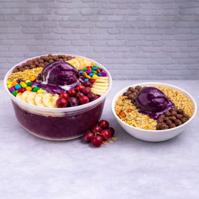 Metade açaí outra metade com cupuaçu com opções de frutas, complementos e coberturas grátis.